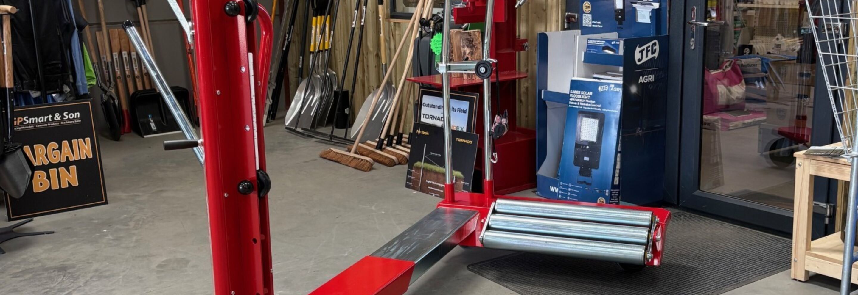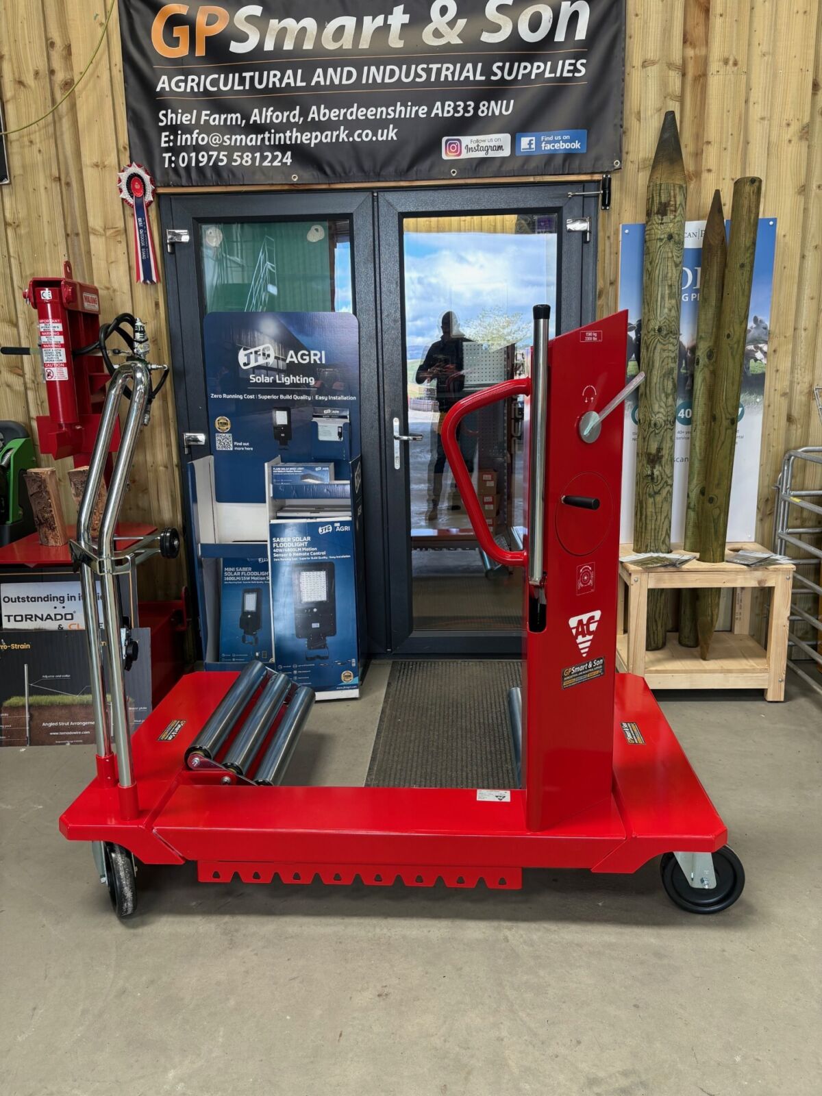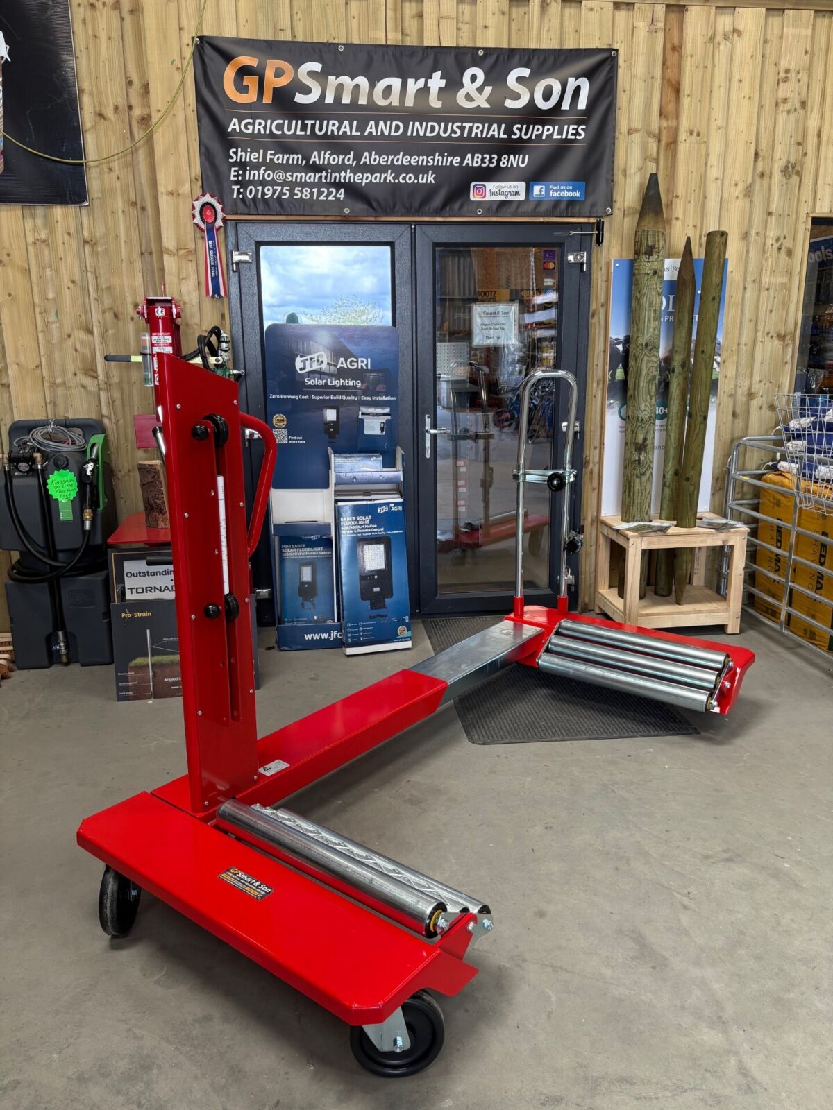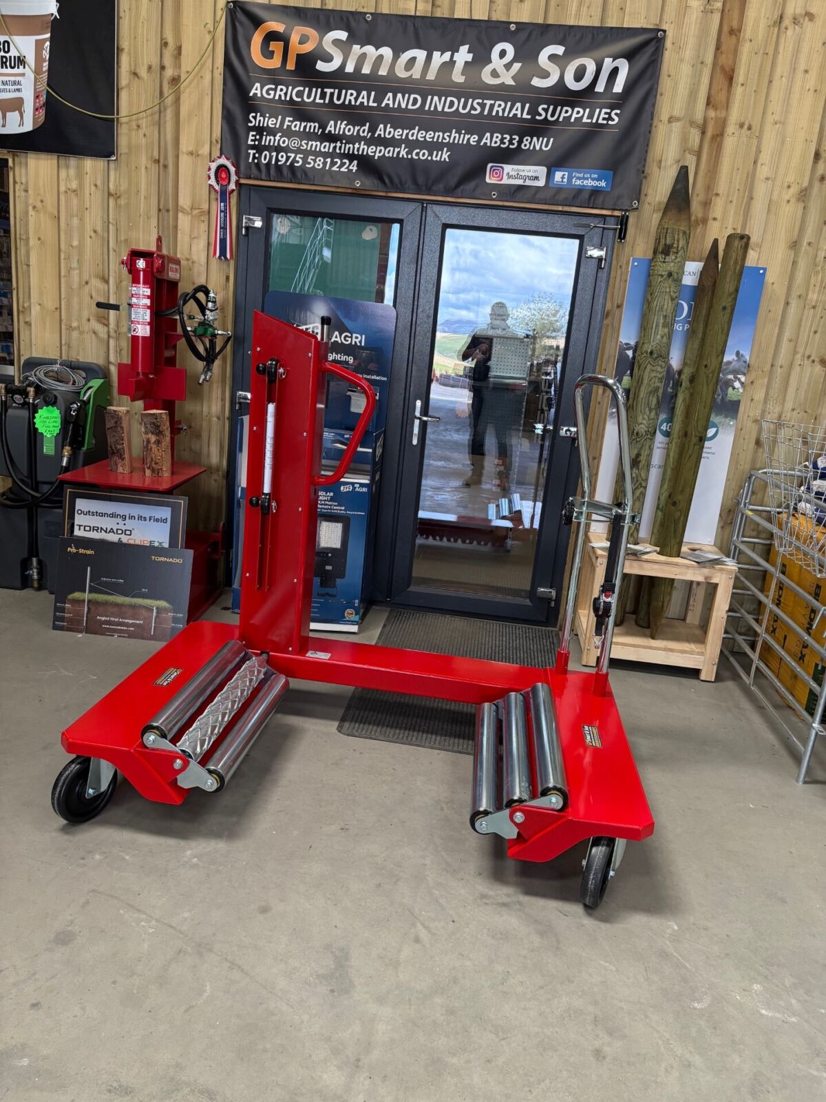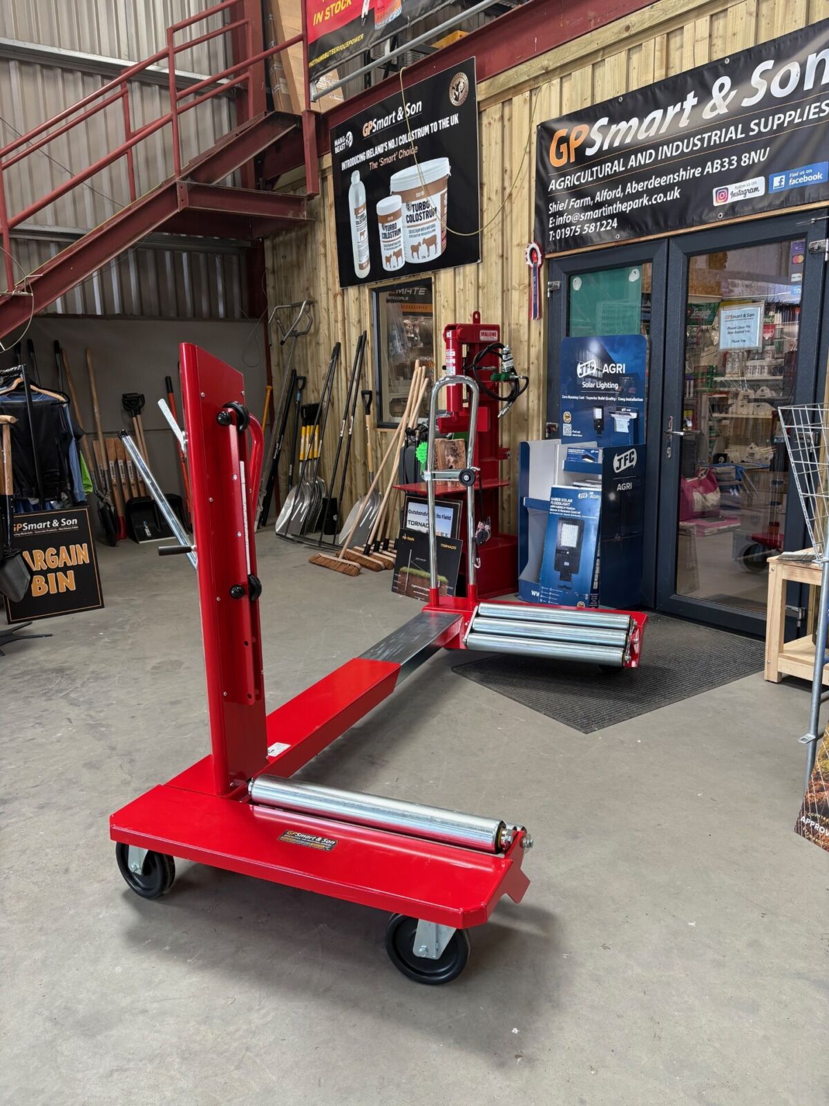 Hydraulic wheel trolley with a handle that facilitates easy turning of large wheel.